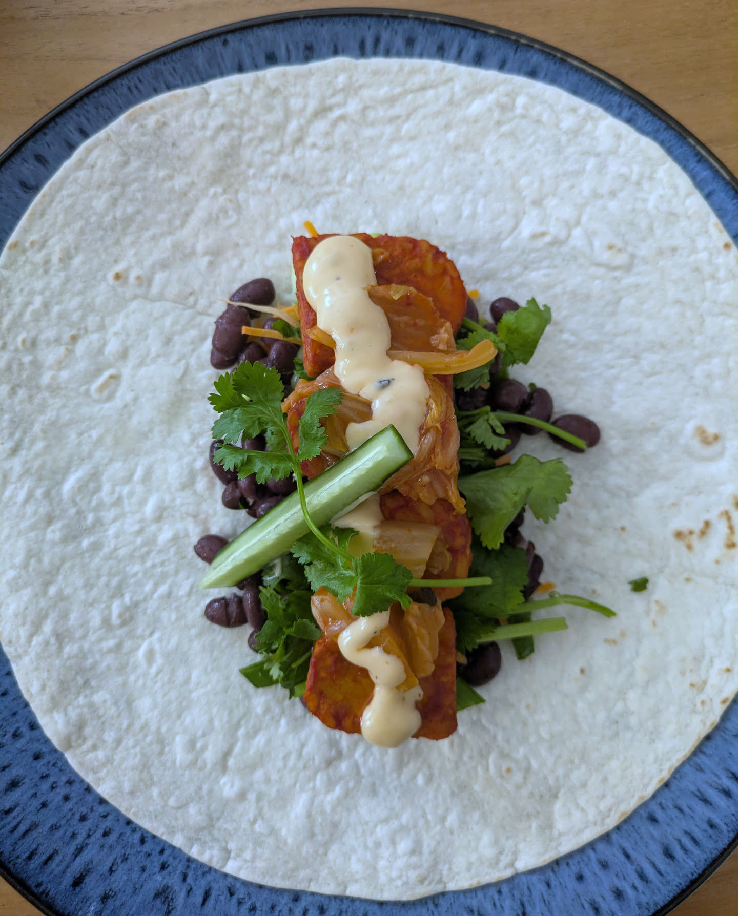 6tortillawraps2 stukswortel, julienne gesneden1 blikzwarte bonen, uitgelekt1 stukskomkommer in reepjesvoldoendeverse koriander1 bosjefijngehakte bosui2 limoenenin partjes1 eetlepelgekke mayo, het liefst met sesam erin- Zout en peper